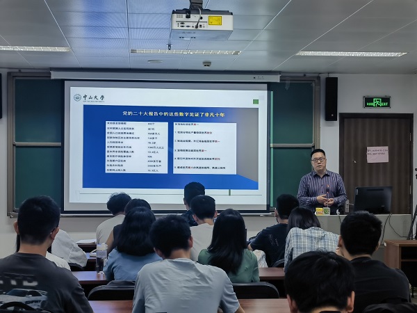 为落实立德树人根本任务,深入学习贯彻二十大会议精神,2023年4月12日下午,太阳成集团tyc234cc党委书记阮映东在数学楼416室为2021级强基班的同学开展了以《学习贯彻中国共产党二十大会议精神,认真领会“再造一个新广东”》为主题的春季学期“思政第一课”。