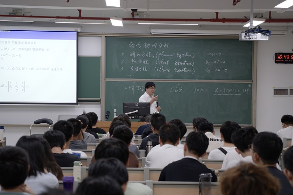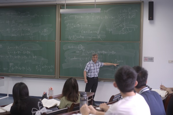 8月31日上午,广州校区南校园震寰堂,头发花白的朱熹平教授正在为数学强基班大三的本科生讲授《偏微分方程》课程,四块黑板写满了擦,擦完了又写满。不用麦克风,但即便站在走廊上,都能听到他声如洪钟的讲课声,讲到投入处,更是不自觉提高了分贝。