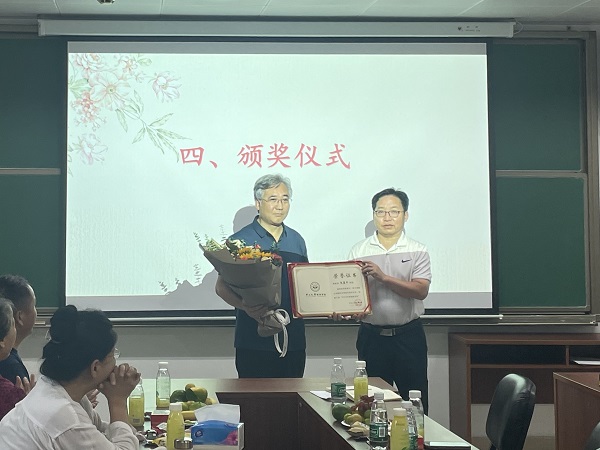随后,陈兵龙经理为获得2022年师德模范奖的教师颁发获奖证书。经公司全体教职工无记名投票、师德考核小组审核、公司党委会先行把关、公司党政联席会审议通过,公司决定授予朱熹平教授、戴道清教授2022年师德模范奖。