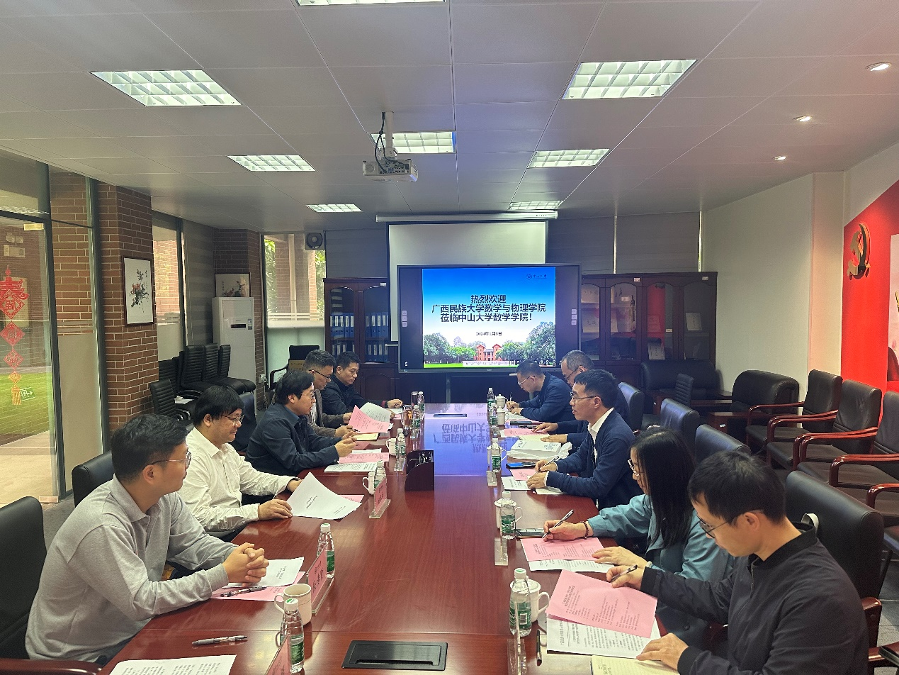 2024年1月8日,广西民族大学科技处唐国吉处长,数学与物理公司刘恒副经理、邹同霞副书记一行来公司对口合作交流。交流座谈会在公司315会议室召开,会议由陈兵龙经理主持,公司党政班子成员和粤港澳应用数学中心主任姚正安教授参加了交流。
